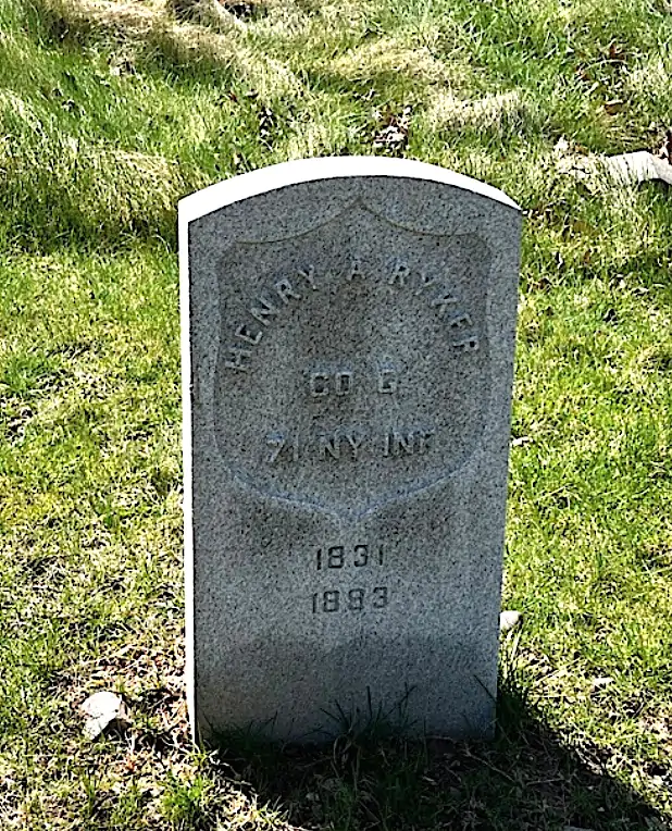 RYKER, HENRY A. (1831-1893). Private, 71st Regiment, New York State National Guard, Company G. A New York native, he enlisted as a private at New York City on May 28, 1862, mustered into the 71st Regiment that day, and mustered out on September 2, 1862, at New York City. He last lived at 32 Remsen Street in Brooklyn. Ryker’s death was caused by pneumonia. Section 14, lot 19438, grave 273.