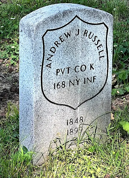 RUSSELL, ANDREW J. (1848-1899). Private, 168th New York Infantry, Company K; 56th Regiment, New York State National Guard, Company I. Russell, who was born in New York City, enlisted there as a private on February 27, 1863, the same day that he mustered into the 168th New York. He mustered out on October 31, 1863, at Newburgh, New York. In 1864, he re-enlisted as a private and served for 100 days with Company I of the 56th New York State National Guard. In 1892, he applied for an invalid pension that was awarded, certificate 843,442. His last residence was on East High Street in Somerville, New Jersey. Russell’s death was caused by rheumatism of the heart. Jennie Russell, received a widow’s pension in 1899, certificate 495,584. Section 82, lot 2360, grave 4.