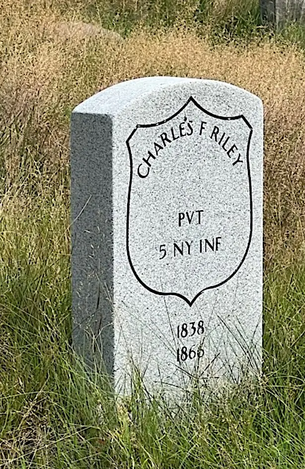 RILEY, CHARLES F. (1838-1866). Private, 5th New York Infantry, Company F. A native of New York City, Riley who was a piano-maker by trade, was 5′ 11″ with brown hair and eyes. After enlisting as a private at New York City on July 20, 1861, he mustered into the 5th two days later. He was wounded in both thighs at Second Bull Run, Virginia, on August 30, 1862, and was discharged for disability on January 17, 1863, at Hammond General Hospital in Point Lookout, Maryland. Section 114, lot 8999, grave 1269.
