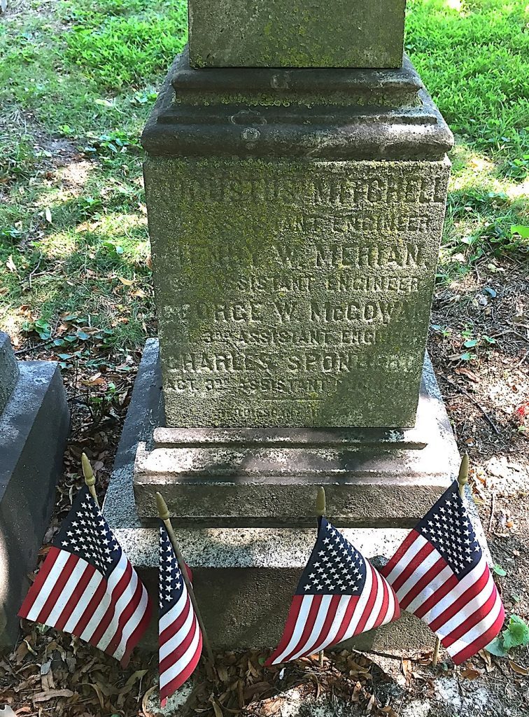 Henry Merian (see), Augustus Mitchell (see), George N. McGowan and Charles Sponberg are remembered in a monument at Green-Wood erected in 1871 and dedicated to their valiant efforts. The monument has a carving on its front that states it was erected by Frances Mitchell, who purchased the lot and is likely the mother of Augustus Mitchell and J. J. Merian, likely the father of Henry Merian. On one side the inscription reads: “SACRED TO THE MEMORY OF FOUR OFFICERS OF THE U.S. NAVY WHO LOST THEIR LIVES BY BEING DROWNED ON THE U.S. MONITOR WEEHAWKEN TO WHICH THEY WERE ATTACHED WHEN SHE FOUNDERED OFF CHARLESTON, S. C. DECEMBER 6, 1863.” The opposite side of the monument is inscribed: , “THE REMAINS WERE EXHUMED FROM THE ENGINE ROOM OF THE WRECKED MONITOR WHERE THEY NOBLY FELL AT THEIR POST OF DUTY. SEPTEMBER 26, 1871. Section 82, lot 20207.
