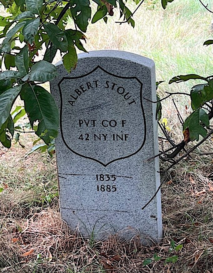 STOUT, ALBERT (or HERBERT) (1835-1885). Private, 42nd New York Infantry, Company F. Born in Germany, Stout enlisted as a private at New York City on May 12, 1861, and mustered into the 42nd on June 22. He was taken as a prisoner of war on June 22, 1864, at Weldon Railroad, Virginia, and released six months later on December 6 at an unstated place. He mustered out on April 4, 1865, at New York City. At the time of his death, he was a resident at the Charity Hospital on Welfare Island in New York City. Section A, lot 9146, grave 307.