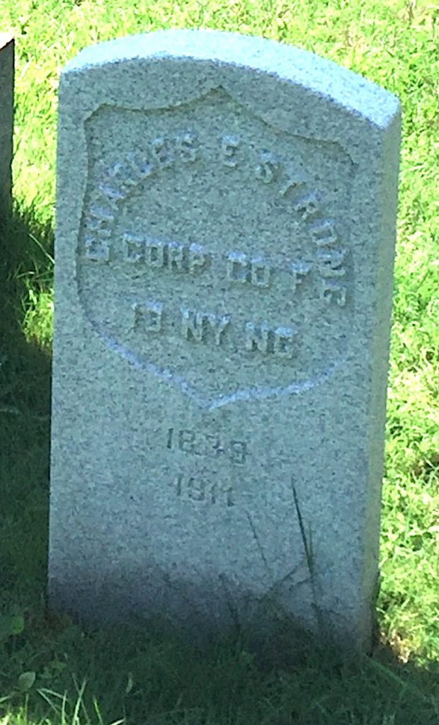 STRONG, CHARLES E. (1839-1911). Corporal, 13th Regiment, New York State National Guard, Company F. Strong enlisted as a corporal at Brooklyn on May 26, 1862, served for three months with the 13th Regiment, and mustered out at Brooklyn on September 12. He was a member of the George C. Strong Post#534 of the G.A.R. In 1904, his application for an invalid pension was granted, certificate 1,091,245. As per his obituary in the New York Press, members of the George C. Strong Post were invited to his funeral. His last address was 287 Sixth Avenue in Brooklyn. Section 173, lot 21554, grave 5.