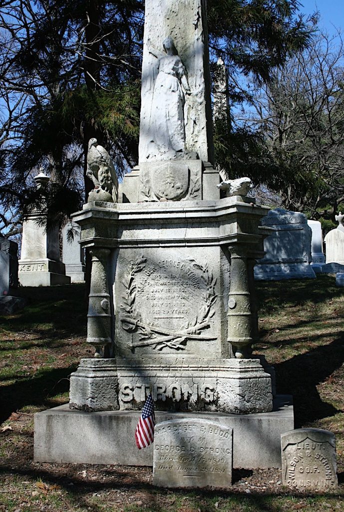 Promoted on January 26, 1861, to first lieutenant, Strong later achieved the rank of captain. On October 1, 1861, he was appointed major and assistant adjutant general of volunteers; that appointment expired on July 17, 1862. According to Jack D. Welsh, M.D., in Medical Histories of Union Generals (1996, p. 324), Strong was in poor health during the summer of 1862, and General Benjamin F. Butler reported that Strong had not fully recovered by that October. Nonetheless, he was promoted to brigadier general in November 1862. He served on the staffs of Generals McDowell and McClellan and was detailed as ordnance officer by General Butler to the Department of the Gulf. After he was wounded in the right thigh by a shell fragment while commanding his brigade (Department of the South, 10th Corps, Second Brigade) during the attack on Fort Wagner, South Carolina, on July 30, 1863, the famous attack depicted in the movie Glory which included the black troops of the 54th Massachusetts, he went home to recuperate. Apparently, Strong at first played down the severity of injury, calling it a severe flesh wound. At first, he was treated aboard the Cosmopolitan, a hospital steamer, then at a general hospital at Beaufort, South Carolina, and finally boarded a steamer home without permission. (Welsh, page 324) He was promoted to major general on July 18, 1863, but tetanus set in and he died in New York City on July 30. The George C. Strong Post #534 of the G.A.R. in Brooklyn honored his service. His last address was 62 East 19th Street, Manhattan. Section 74, lot 7204.