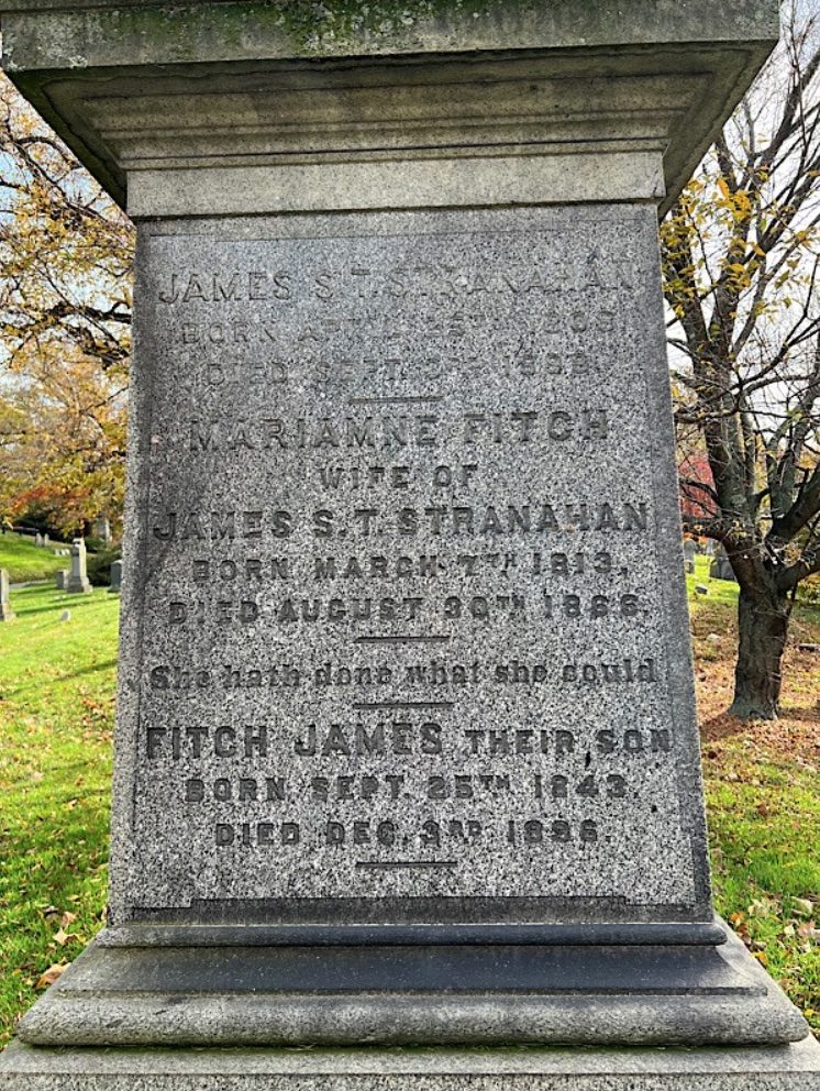 Stranahan was responsible in large part for spearheading the hugely successful Great Fair of Brooklyn, of which she wrote, “The aggregate of our efforts including the results of our Great Fair, represents a money value of not less than half a million dollars.” Of the proceeds, $300,000 went to the United States Sanitary Commission and $200,000 for hospital supplies. The Reverend Dr. Bellows, President of the United States Sanitary Commission, offered these words of praise in describing Brooklyn as a shining example for other cities and Stranahan’s leadership, “…As earnest, large, and noble in her views of what was due to the National cause, as the most zealous could be, she was yet so practical, judicious, and sober in her judgment, that what she planned, I learned to regard as certain of success…I have always supposed that her wisdom, resolution, and perseverance, had a controlling influence in the glorious success of the Brooklyn Relief Association-the most marked and memorable fellowship of women, united from all sects and orders of Christians, in one practical enterprise, that the world ever saw.” In ill health after the War, she withdrew from her activities, went to the Green Mountains to restore her strength, but died in Manchester, Vermont. She last lived at 11 Amity Street in Brooklyn. Section 81, lot 1826.