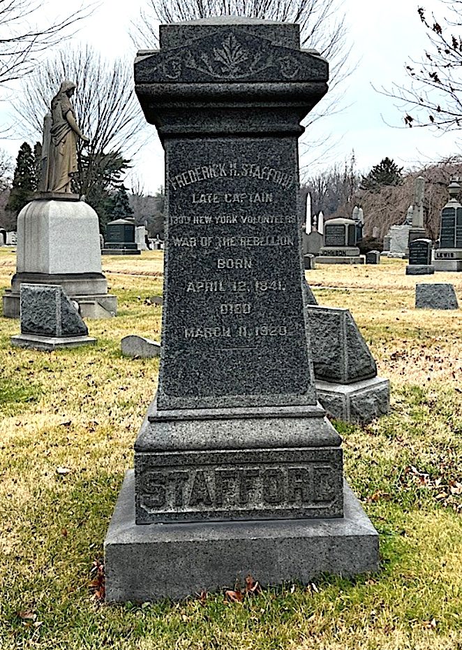 STAFFORD, FREDERICK H. (1841-1920). Captain, 139th New York Infantry, Companies F and G; private, 13th Regiment, New York State Militia, Company D. Born in New York City, Stafford enlisted as a private in 1861 and served for three months with the 13th Regiment. After re-enlisting as a first lieutenant on an unknown date, he was commissioned into Company F of the 139th New York where he was promoted to captain at some point before his discharge from Company G. Further details of his service in the 139th are unknown. His pension record indicates that he also served in the United States General Service. In 1891, his application for an invalid pension was approved, certificate 877,113. His last residence was 1227 M Street, Washington, D.C. Section 145, lot 24060, grave 3.