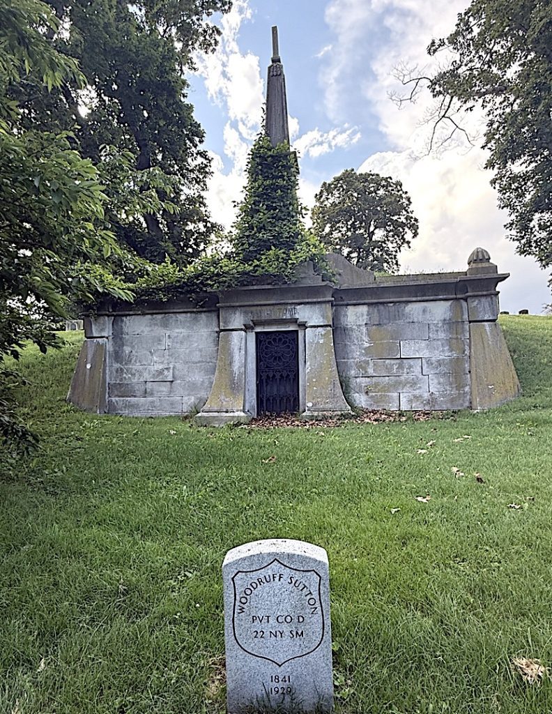 Sutton was listed as a merchant in the 1870 and 1878 New York City Directories. The 1880 census reports that he was living with his parents, siblings, and son in West Islip, New York. He joined Lafayette Post #140 of the G.A.R. on September 20, 1886, listing his occupation as merchant. He lived at 1072 Madison Avenue at that time. The 1894 New York City Directory lists him as a merchant. He last lived in Babylon, New York. The cause of his death was cerebral apoplexy. Note that Civil War veteran Woodruff Sutton was born in 1841 and died in 1896; his son, who was born after the Civil War, is the Woodruff Sutton who died in 1929. Section 119, lot 5713.