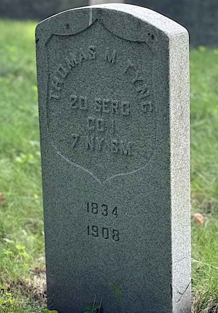 TYNG, THOMAS MITCHELL (1834-1908). Second sergeant, 7th Regiment, New York State Militia, Company I. Born in Philadelphia, Pennsylvania, and the son of Reverend Stephen Tyng (see), he first served as a private in the 7th Regiment for 30 days in 1861. When the 7th was reactivated for three months the next year, he was promoted to second sergeant and served in same company as Charles Tyng (see). In 1907, he was awarded a pension, certificate 1,143,961. He last lived in Bayonne, New Jersey. Section 99, lot 11479.