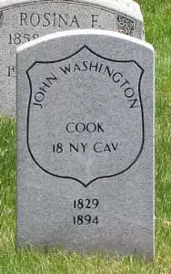 WASHINGTON, JOHN (or GEORGE) (1829-1894). Cook, 18th New York Cavalry, Company H. He enlisted on January 4, 1864, at Troy, New York, as a colored cook, and mustered into the 18th New York Cavalry on October 4, 1864. Other details of his service are not known. Section 135, lot 27263, grave 1016.