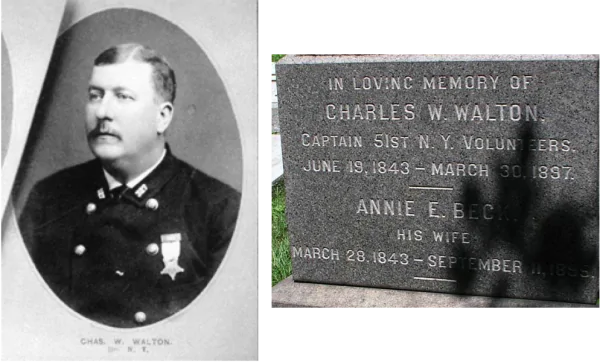 WALTON, CHARLES W. (1843-1897). Captain, 51st New York Infantry, Companies B, D, and E. Born in Norwalk, Connecticut, he enlisted at New York City on September 23, 1861, as a private, and mustered into Company B of the 51st New York on October 18. The 51st Regiment was part of the Second Division, 9th Army Corps, fighting in over 20 major combat actions including New Berne, North Carolina; Antietam and South Mountain, Maryland; Bull Run, Fredericksburg, the Wilderness, Spotsylvania, and Petersburg, all in Virginia; Vicksburg, Mississippi; and the East Tennessee Campaign.