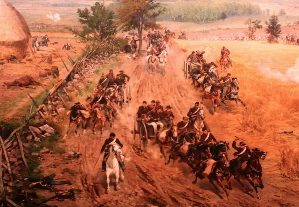 July 1, 1863 “…Smiling orchards, huge barns, groups of cattle, and a few scampering horses in a pasture near a brook completed the pastoral scene. Like an avalanche, the corps descended into the valley. The infantry marched into the wheat field, trampling down the ripening grain, while the artillery seized the meadows and the hay. Tents were put up, and the men were quietly eating their suppers, when the news ran from fire to fire that the First and Eleventh corps had struck the enemy, and that General [John] Reynolds had been killed. Twenty minutes after, the bugles began winding the call “Strike tents and march away.” The bugle notes had scarcely ceased before the entire corps of sixteen thousand men was in line for a night march of eighteen miles. The route ran through a succession of small villages. The houses were all illuminated, while among the cherry trees, beside the road, stable lanterns had been hung. The inhabitants exhausted their stores of bread, honey, coffee, milk, and cheese by giving it freely to the men in the marching column. All night these people stood at their garden gates watching the solid masses of infantry tramp steadily forward…”