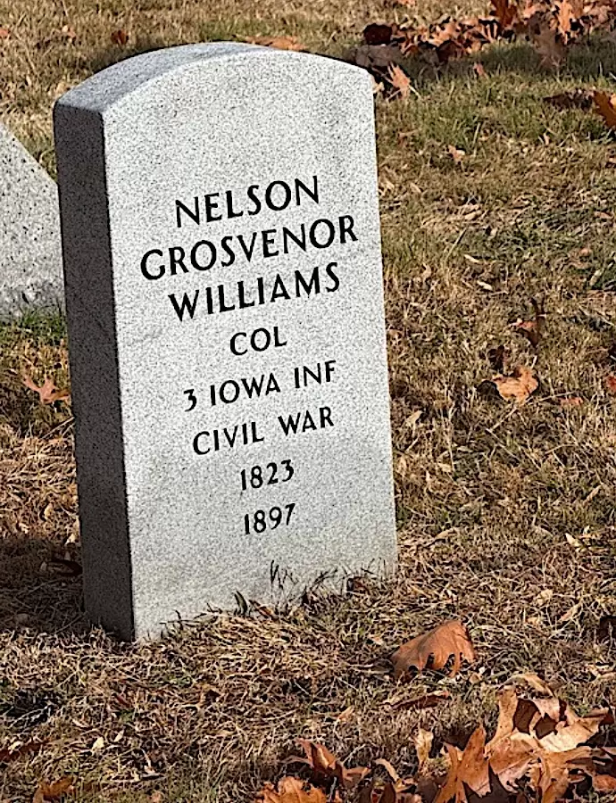 WILLIAMS, NELSON GROSVENOR (1823-1897). Colonel, 3rd Iowa Infantry. Born in Bainbridge, New York, he entered West Point in 1839, the same year as Ulysses S. Grant, but resigned after one year because he had difficulty with mathematics. For the next 15 years he worked in the importing business in New York City, then moved to Iowa, where he farmed and ran a general store.