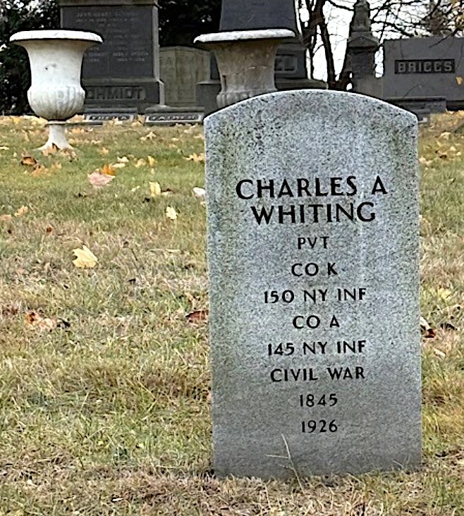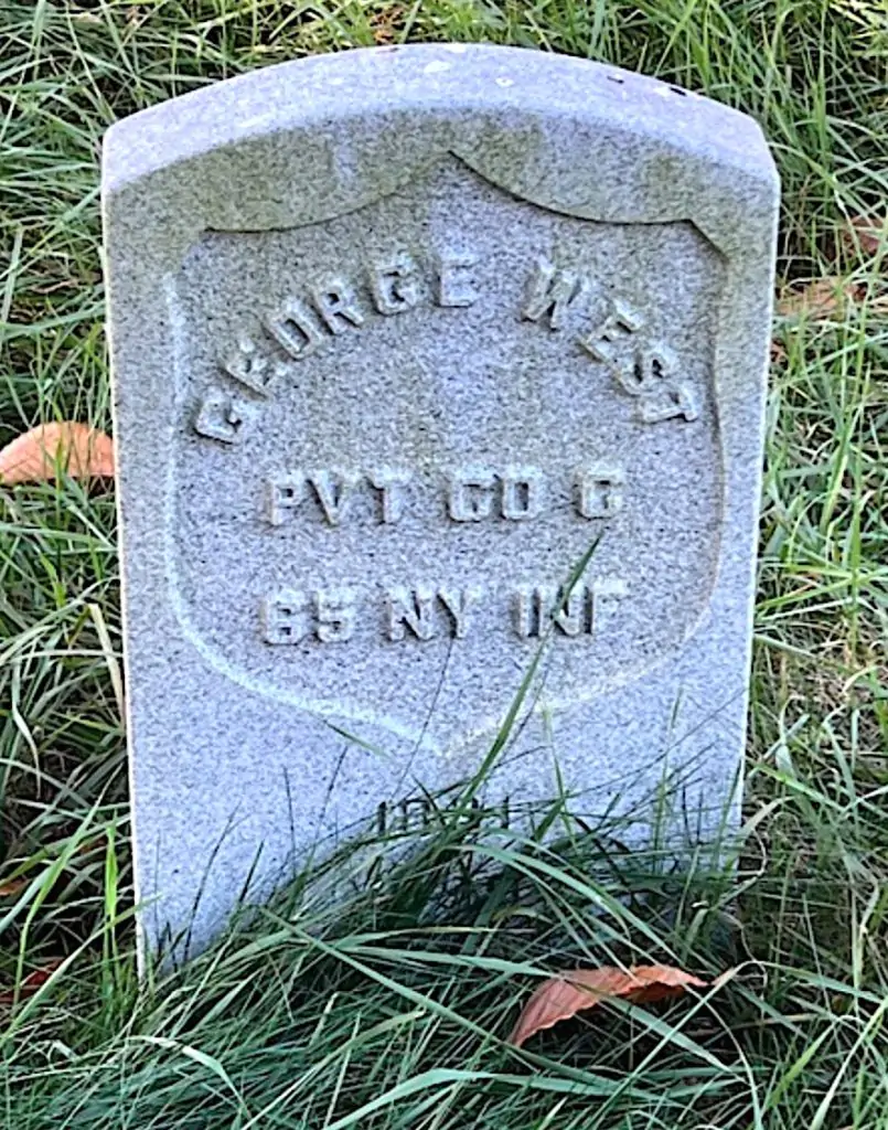 WASHBURN, GEORGE W. (1835-1901). Private, 83rd New York Infantry, Company G. Born in New York, he enlisted and mustered into the 83rd at New York City on May 27, 1861. He was wounded at Fredericksburg, Virginia, on December 13, 1862, and mustered out after serving three years on June 23, 1864, at New York City. He was likely the brother of Daniel Washburn (see). He last lived at 22 West 16th Street in Manhattan. Washburn died of heart disease. Section 43, lot 338.