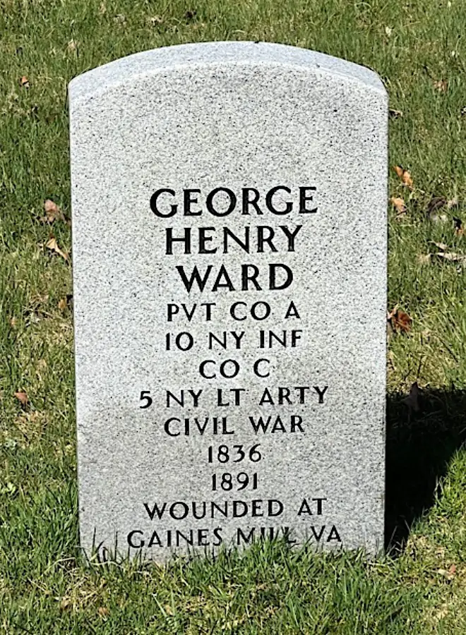 WARD, GEORGE HENRY (1836-1899). Private, 10th New York Infantry, Company A; 5th New York Heavy Artillery, Company C. Born in New York City, he enlisted on April 26, 1861, and mustered into the 10th New York the next day. As per his muster roll, he was a carpenter who was 5′ 5” tall with grey eyes, black hair and a fair complexion. After being taken as a prisoner of war on an unknown date and place, he was paroled. He was wounded on June 27, 1862, at Gaines’ Mill, Virginia, and mustered out on May 6, 1863, at New York City. On December 19, 1863, he mustered into the 5th New York Heavy Artillery. Although his muster roll notes that he deserted in June 1864, at Martinsburg, Virginia, he was recorded as “present” on the muster roll in October 1864. He mustered out on June 13, 1865, at Harpers Ferry, West Virginia. His last residence was on 9th Avenue in Manhattan; his death was caused by pneumonia. In 1901, Caroline Ward’s application for a widow’s pension was granted, certificate 514,589. Section 181, lot10969, grave 3.