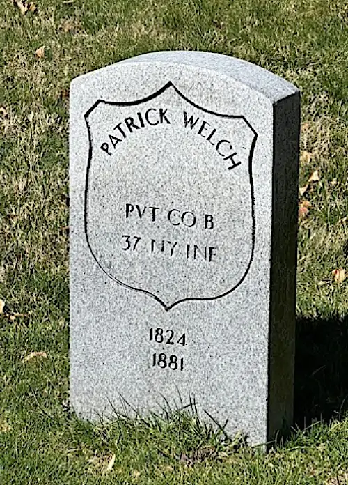 WALTON, JOHN (1838-1896). Sergeant, 99th New York Infantry, Companies K, C, and B. Walton enlisted and mustered into Company K on January 30, 1862, at Boston, Massachusetts, as a private. He was promoted to corporal, then sergeant on August 1, 1863, served as a sergeant in Company C, and was transferred to Company B on September 20, 1864. He was discharged on January 28, 1865, at New Berne, North Carolina. Walton’s death was caused by mitral regurgitation. Section 135, lot 14964, grave 711.