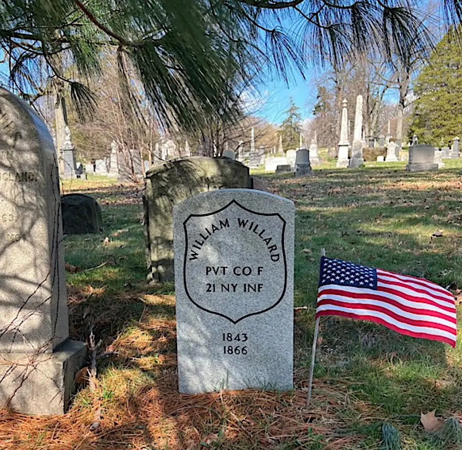 WILLIS, JOHN (1844-1922). Private, 18th New York Cavalry, Company F. On January 11, 1864, Willis enlisted as a private at New York City and mustered into the 18th New York Cavalry. He deserted at Camp Stoneman, Virginia, on February 5, 1864. His last residence was on Cumberland Street in Brooklyn. Section 135, lot 30010, grave 581.