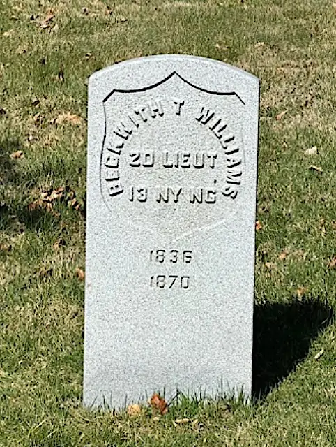 WILLIAMS, BECKWITH T. (1836-1870). Second lieutenant, 13th Regiment, New York State National Guard, Company A. Beckwith, who was originally from Ireland, served with the 13th Regiment’s Heavy Artillery for three months in 1862. He last lived on Classon Avenue in Brooklyn. Section 181, lot 12165.