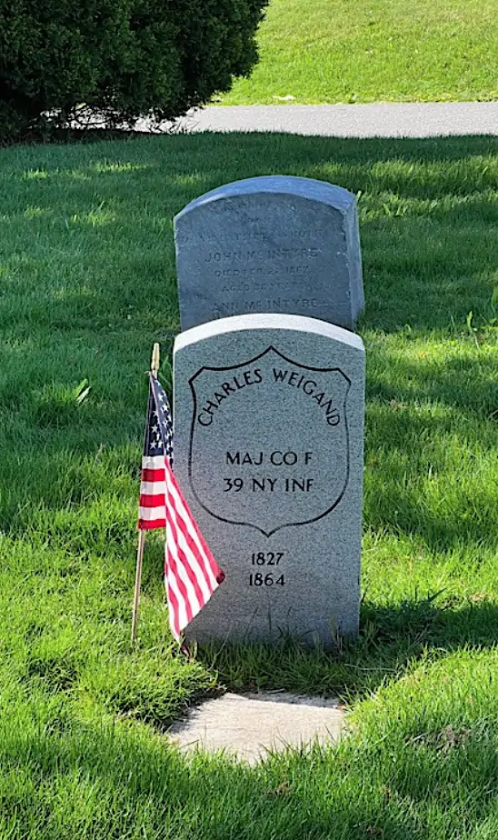 In 1867, Wassweiler married Ermelia Ernst. As per the 1877 Brooklyn Directory, he was employed as a decorative house painter. The Brooklyn Directory for 1888-1890 lists Wassweiler as a painter; he then lived at 969 Fourth Avenue in Brooklyn. The Veterans Census of 1890 confirms his Civil War service. On June 10, 1891, he married Emma (Emily) Landwhemer in Brooklyn. The 1905 New York State census indicates that he was married, lived in Brooklyn with his wife and daughter and was still employed as a painter. He last lived in Brooklyn. Emily Wassweiler applied for and received a widow’s pension in 1910, certificate 698,485. This veteran’s service and interment were discovered when students in a high school history class in San Jose, California, studied their family trees in 2018. Section 13, lot 19694, grave 372.