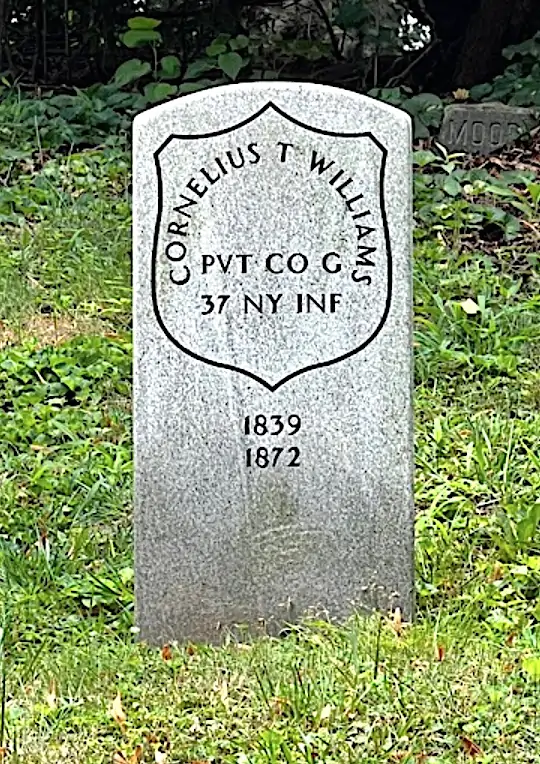 WILLIAMS, CORNELIUS T. (1839-1872). Private, 37th Regiment, New York State National Guard, Company G. A New York State native, Williams enlisted as a private and mustered into his company on May 29, 1862. He mustered out three months later on September 2 at New York City. Williams last lived at 39 West 51st Street in Manhattan. Section 67, lot 14015.