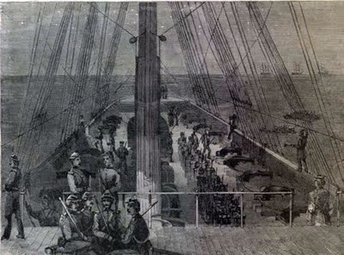 DISEMBARKING THE TROOPS FROM THE U. S, SHIP “BROOKLYN” TO REINFORCE FORT PICKENS, APRIL 13, 1861. [SKETCHED BY AN ENGINEER OFFICER ON BOARD.]