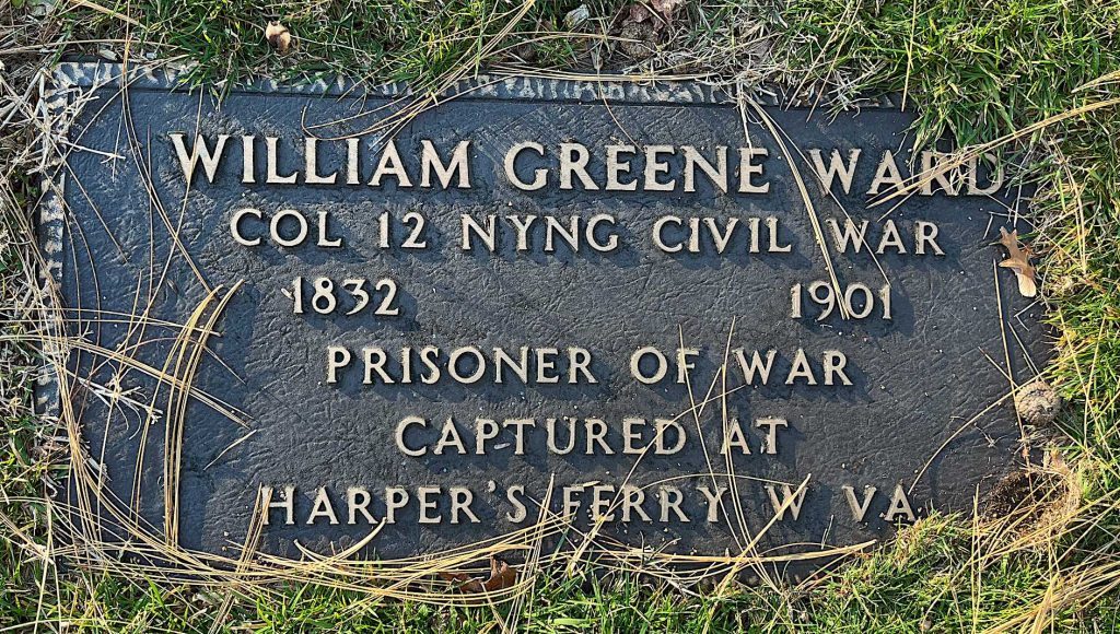 WARD, WILLIAM GREENE (1832-1901). Colonel, 12th Regiment, New York State National Guard. Grandson of Revolutionary War Lieutenant Colonel Samuel Ward, William Greene Ward, who was born in New York City, was a banker and graduate of Columbia College, class of 1851, and New York University Law School. He joined the 12th New York State Militia as its lieutenant colonel on April 19 and served through August 4, 1861. On May 31, 1862, he returned to service with the 12th New York National Guard as its colonel. Ward was captured during the fighting at Harpers Ferry, (now West Virginia), on September 14 and paroled the next day. He mustered out on October 8, 1862. He later served with Dana’s Division and Couch’s Corps in Pennsylvania in 1863.