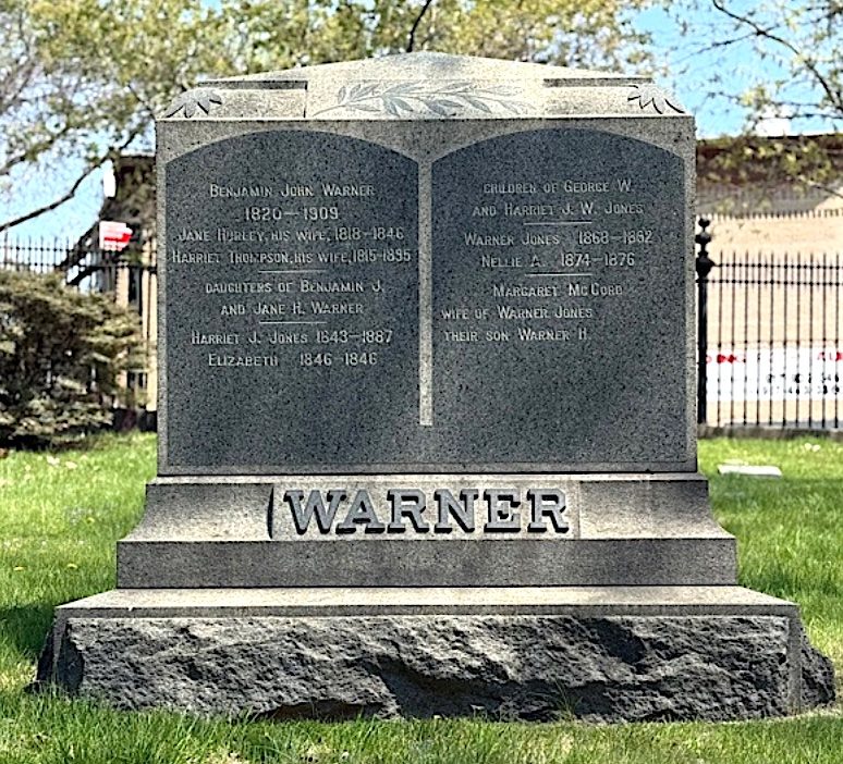 A watch manufacturer, Warner is said to have originated the art of colored photo-engraving on the inside of watch cases. His obituary also notes that he conceived the idea of a tunnel under the East River as early as 1883 that would serve as a pedestrian walkway between Brooklyn and Manhattan. That vision did not consider cars traversing the tunnel. Warner’s last residence was 81 Morton Avenue, Brooklyn. Section 202, lot 29040, graves 1 and 2.