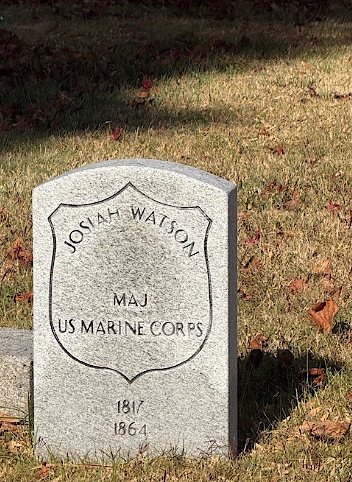 WATSON, JOSIAH (1817-1864). Major, United States Marine Corps. Watson, who was born in Washington, D.C., began serving in United States Marine Corps as a second lieutenant on June 21, 1835. He rose to first lieutenant on March 3, 1847, to captain on December 10, 1855, and to major on November 16, 1861. He last lived at 26 Garden Street in Brooklyn. He died from consumption. Section 162, lot 14384.
