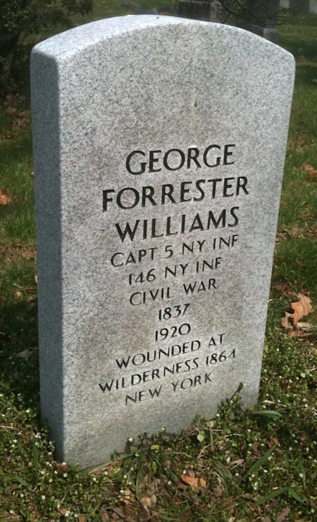 During the Civil War, he enlisted as a private on August 8, 1862, and mustered immediately into Company D of the 5th New York Infantry. As per his muster roll, he was a hatter who was 5′ 7″ tall with blue eyes, light hair and a light complexion. He was transferred to Company I of the 146th New York on May 4, 1863, and promoted to corporal on an unknown date. On May 5, 1864, he was wounded by shell fragments in the left leg below the knee and captured at the Battle of the Wilderness, Virginia. Williams was then confined at Andersonville and Florence Prisons before he was paroled at Savannah, Georgia, on November 30, 1864. After being treated at a hospital at Annapolis, Maryland, he returned to duty on May 8, 1865, and mustered out near Alexandria, Virginia, on June 3, 1865.