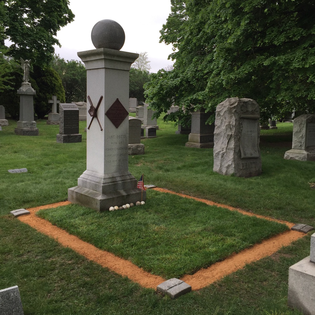 Chadwick’s monument, paid for by A.G. Spalding and Charles Ebbets, is spectacular, with his name, life dates, and “Father of Base Ball” inscribed on a bronze baseball diamond on its front, and crossed baseball bats, a catcher’s mask and a glove on the sides. It is topped by a large granite globe, a Victorian symbol of eternity (with no beginning and no end). But this globe is very special: laces–looking just like those on a baseball–have been carved into it. That’s all great–but this trip to the Chadwick grave was even more exciting than usual. The lot, more 108 years ago, had its corners marked by granite carved to look like baseball bases. Just days before this visit, Green-Wood staff installed basepaths to connect those bases. It looked great!