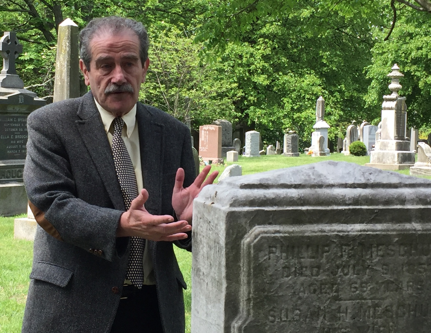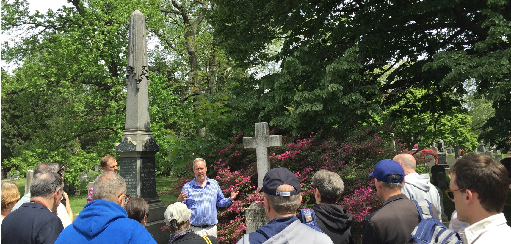After the unveiling of the gravestone, Tom Gilbert, author of “Playing First: Early Baseball Lives at Brooklyn’s Green-Wood Cemetery,” led a baseball trolley tour across Green-Wood’s grounds, stopping at the graves of many of James Whyte Davis’s Knickerbocker teammates and several others who pioneered the National Pastime: the game of baseball.