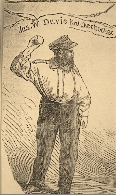 James Whyte Davis was a baseball pioneer. He began playing with the Knickerbockers Base Ball Club of New York City in 1845. He was a leading Knickerbocker player and then an officer of of the club, serving as the Knickerbockers’ president from 1858 to 1860. He wound up with the Knicks tattered early banner–it spent many years draped across his dresser.