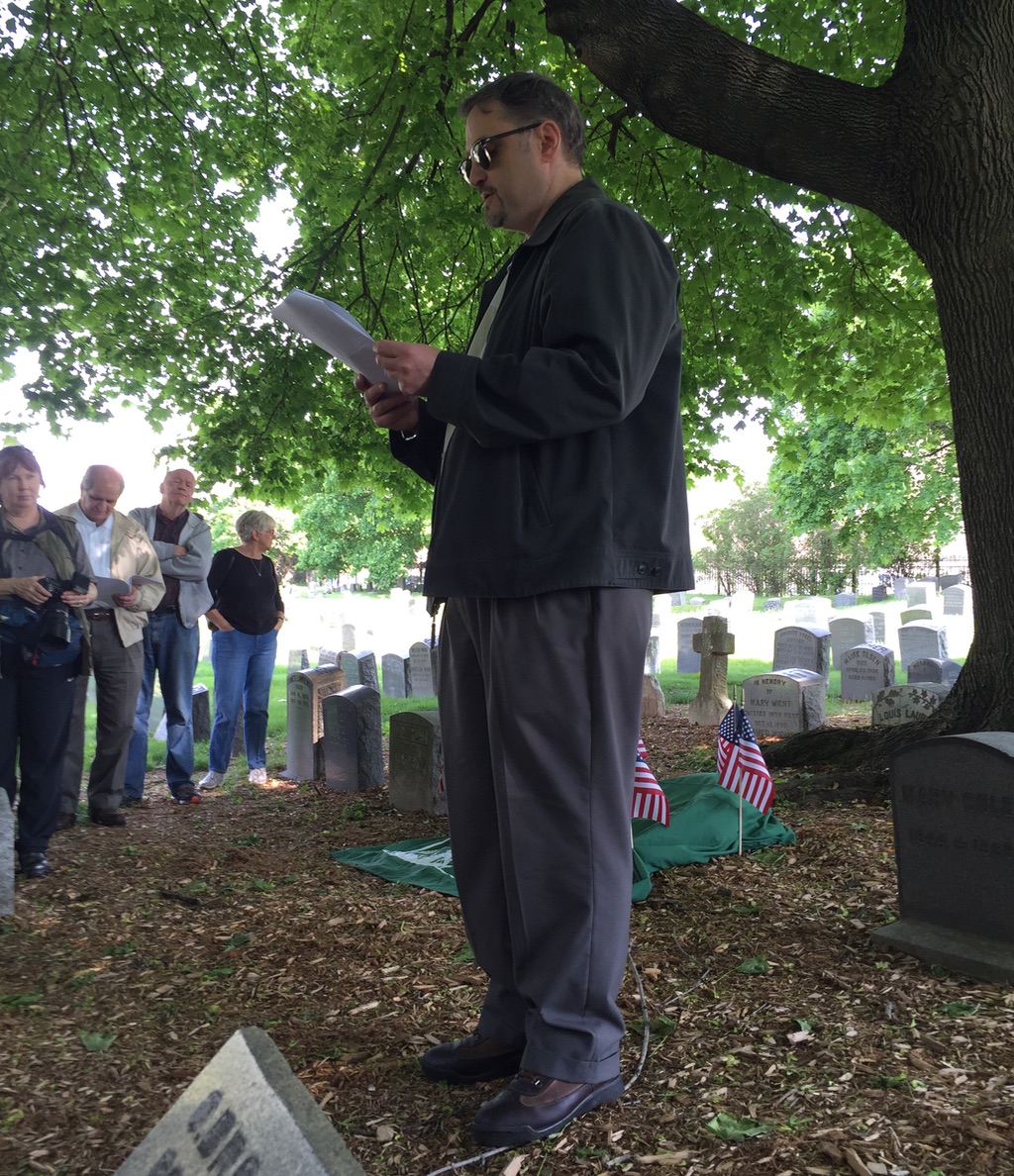 One particularly poignant stop was at the grave of Louis Fenn Wadsworth. John Thorn spoke eloquently there of his search for a man who had been named in the Mills Report of 1907, an investigation into the origins of baseball, by the name of “Mr. Wadsworth,” who had played a key role in baseball history. But the report gave no first name and John had spent years trying to track this Wadsworth down. Just weeks ago, he posted his findings here. It is a fascinating read! Here’s just a small part of this remarkable story: when baseball’s pioneers met in convention in 1857, one of the matters to be determined was the length of games. The practice had been to play until one team scored 21 runs. However, the players wanted a different rule; they agreed, in a vote, that a game would last 7 innings. The newspapers reported this decision. But, after those reports had gone out, Louis Fenn Wadsworth stood before the convention and made an impassioned plea that a game last 9 innings; he was so convincing that the convention reversed itself and agreed to his proposal. Wadsworth went on to become a judge in New Jersey, then sadly became an alcoholic, drank away his fortune, and signed himself into a home for indigents in Plainfield. There he lived the last 10 years of his life in complete anonymity, never having a visitor, but always, for reasons unknown to the others there, interested in the scores of baseball games.