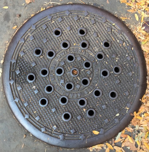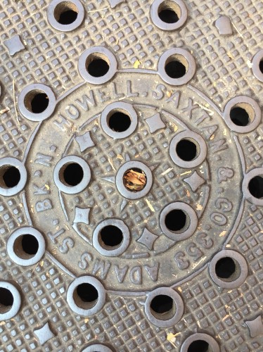 A coal chute cover, on the sidewalk in front of 161 Congress Street, Brooklyn, cast by Howell and Sartain.Detail of the same coal chute cover.
