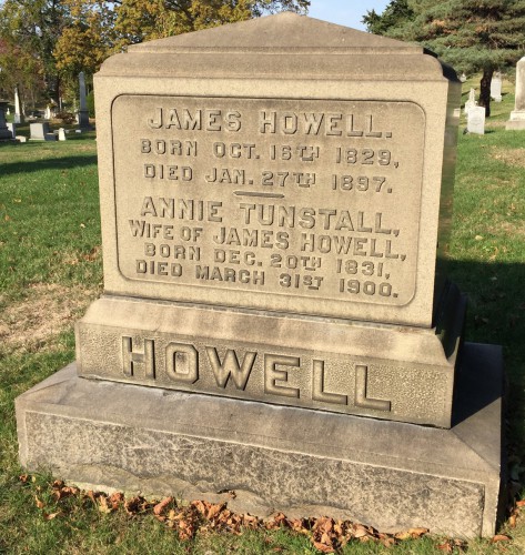 We recently heard from Linda Welsh, great great granddaughter of James Howell Jr. (1829-1897) and Annie Tunstall Howell (ca. 1832-1900). They are interred at Green-Wood in section 113, lot 16983. She writes:
