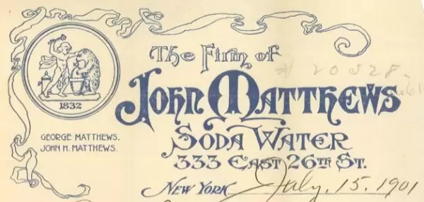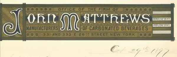 John Matthews (1808-1870) trained in his native England in the manufacture of devices to carbonate drinks. He immigrated to New York City in 1832 and established his business at 55 Gold Street in Manhattan, where he made carbonated drinks popular and manufactured elaborate soda fountains.