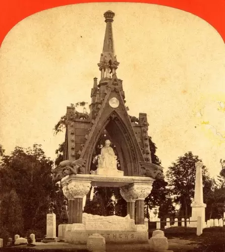 It would be impossible to blog about John Matthews without discussing his spectacular memorial at Green-Wood. It is a wonder! This exuberant work, shown below, was designed by Karl Muller (1820-1887), a German and French-trained goldsmith and sculptor who immigrated to the United States around 1850. Its overall form was of a type typically reserved for royalty, Popes, and the elite.