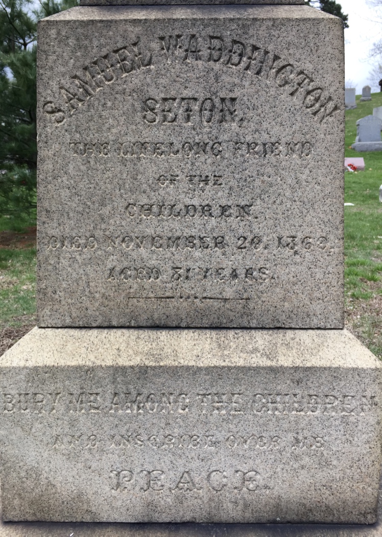 Samuel W. Seton made three requests before he died: that specified flowers be placed on his grave, that he be interred with the children in their lot at Green-Wood, and that his gravestone be inscribed “Peace.” It appears that all of these requests were granted.