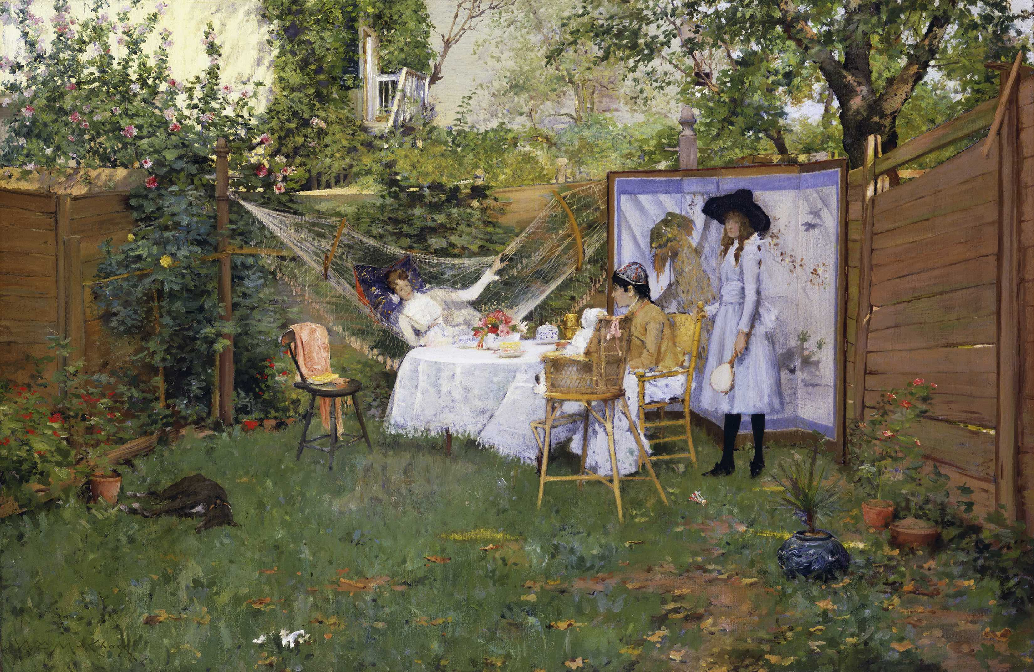 Courtesy, Museum of Fine Arts, Boston. Chase married his favorite model, Alice Gerson, in 1887, and the couple moved in with her parents in Brooklyn. Here Chase captures his family at leisure in their Brooklyn backyard: from left to right, their pet greyhound Fly rests, Alice’s sister lies in the hammock, their daughter Cosy sits in the high chair, Alice sits with the baby, and Chase’s sister, Hattie, holds a racquet, a young woman with physical activity in her plans. The painting, with a bright palette, shows a suburban, modern family with leisure time.