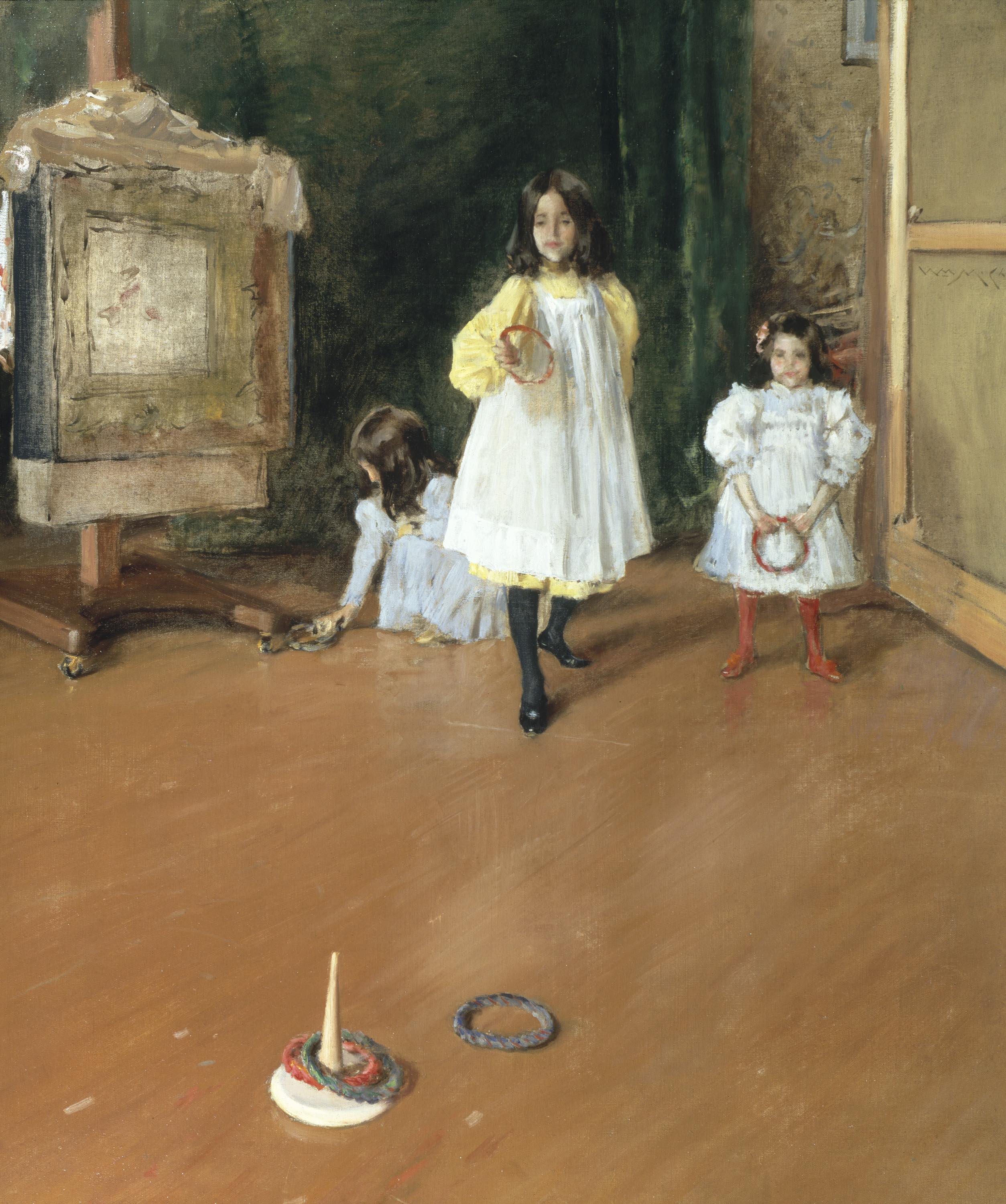 Courtesy, Museum of Fine Arts, Boston. Here his daughter, Cosy, is about to toss a ring as her younger sisters, Koto and Dorothy, await their turns. The setting is the Chase home in Shinnecock; for Chase, home and studio were one and the same.