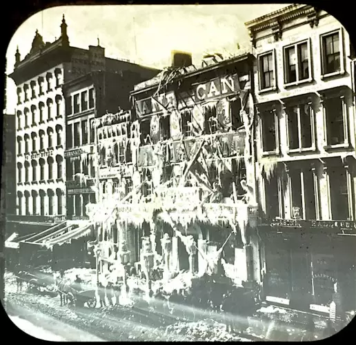 Some of these photographs date from the 1860s but were published as lantern slides several decades after they were taken. For instance, the ruins of P.T. Barnum’s Museum, on Broadway, were photographed in March 1868, just after the fire there (Barnum’s museums and circuses suffered repeated fires–in 1864, 1865, 1868, and 1872):