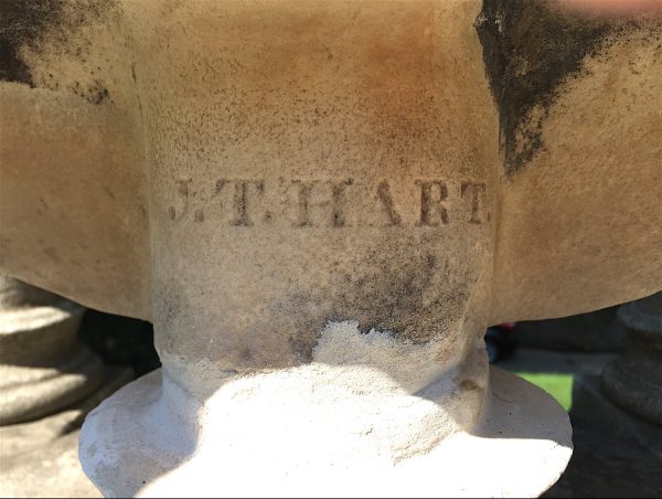 Hart traveled outside Kentucky, was hailed for his work, and soon began to sculpt Henry Clay, from life, starting in 1846 and completing that work years later. That sculpture is signed “J.T. Hart”–the same signature that appears on the Mary Baldwin Norris sculpture at Green-Wood. Then Hart was off to Europe, setting up his studio in Florence, Italy, then spending 14 months in London studying anatomy. Widely hailed in Europe and in the United States, Hart received many commissions for marble busts. Though critics were mixed on the quality of Hart’s sculptures, sculptor Hiram Powers hailed Hart as “the best bust-maker in the world.”