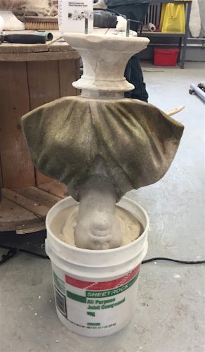 Neela and her staff brought the pieces–bust and base–down to their Restoration Studio. There, the remnant of the base was used to create a mold and the mold was then used to cast a new base. Here’s the new base, in the studio, attached to the bust: