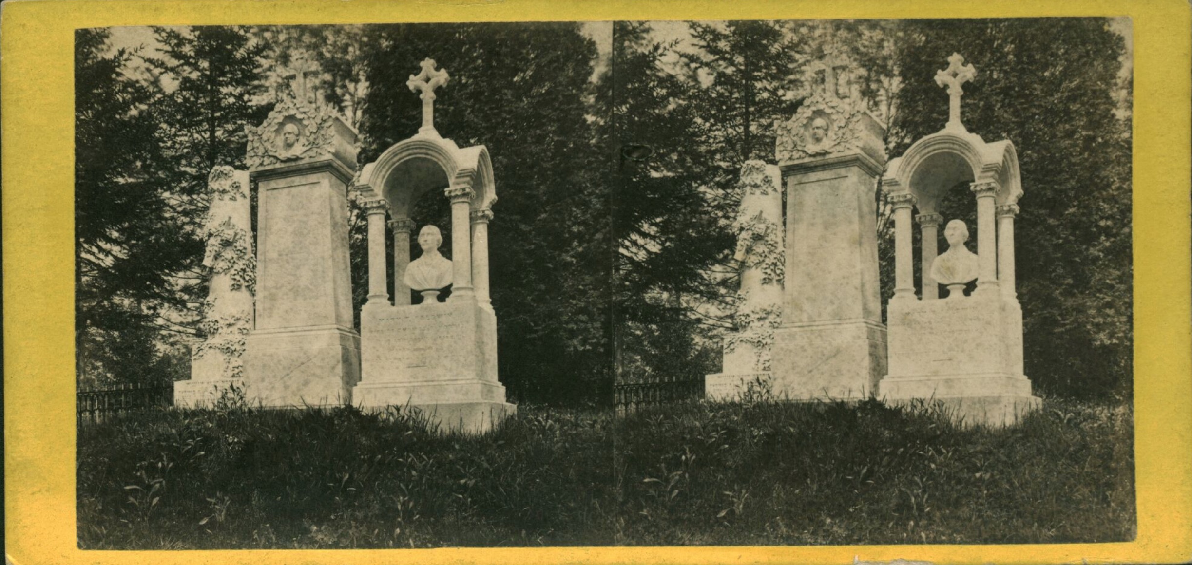 I was able to determine that the above stereoview was taken in section 77, lot 1968–the Norris Family Lot. The label on the back of the card identifies the view as “Monument of Mary T. Baldwin.” That was her maiden name; her married name was Mary T. Norris (and that is the name under which her burial at Green-Wood is recorded). The lot is on the east side of Dell Avenue, between Central and Southwood Avenues, and is visible from Dell Avenue. Mary, as per Green-Wood’s records, was interred there on June 11, 1862.
