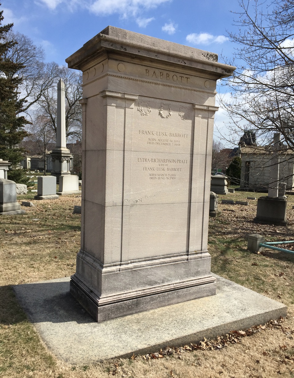 In section 65, lot 33055, between Vine Avenue and Celastrus Path, stands the monument memorializing Frank Lusk Babbott (1854-1933) and Lydia Babbott (1858-1904). Frank Babbott was a Brooklyn banker, jute merchant, art collector, and philanthropist. He had a great passion for education, serving as vice president of the Brooklyn Board of Education, then as a member of the New York City Board of Education. He was on the board of Pratt Institute and was for many years president of the board of trustees of Packer Collegiate Institute. He served as the honorary president of the Brooklyn Institute of Arts and Sciences, now known as the Brooklyn Museum. In 1925, he was made a Chevalier of the Legion of Honor of France for his lifelong work in education. He was also a trustee of the Brooklyn Academy of Music, Vassar College, the YWCA of Brooklyn, and the Brooklyn Public Library. Upon his death, the Brooklyn Eagle described him as “a public benefactor” and concluded, “His was the highest type of good citizenship.” A very wealthy man, he left $1.5 million in his will for a fund to support medical education, the equivalent of almost $29 million today. And that was just a part of his philanthropy!
