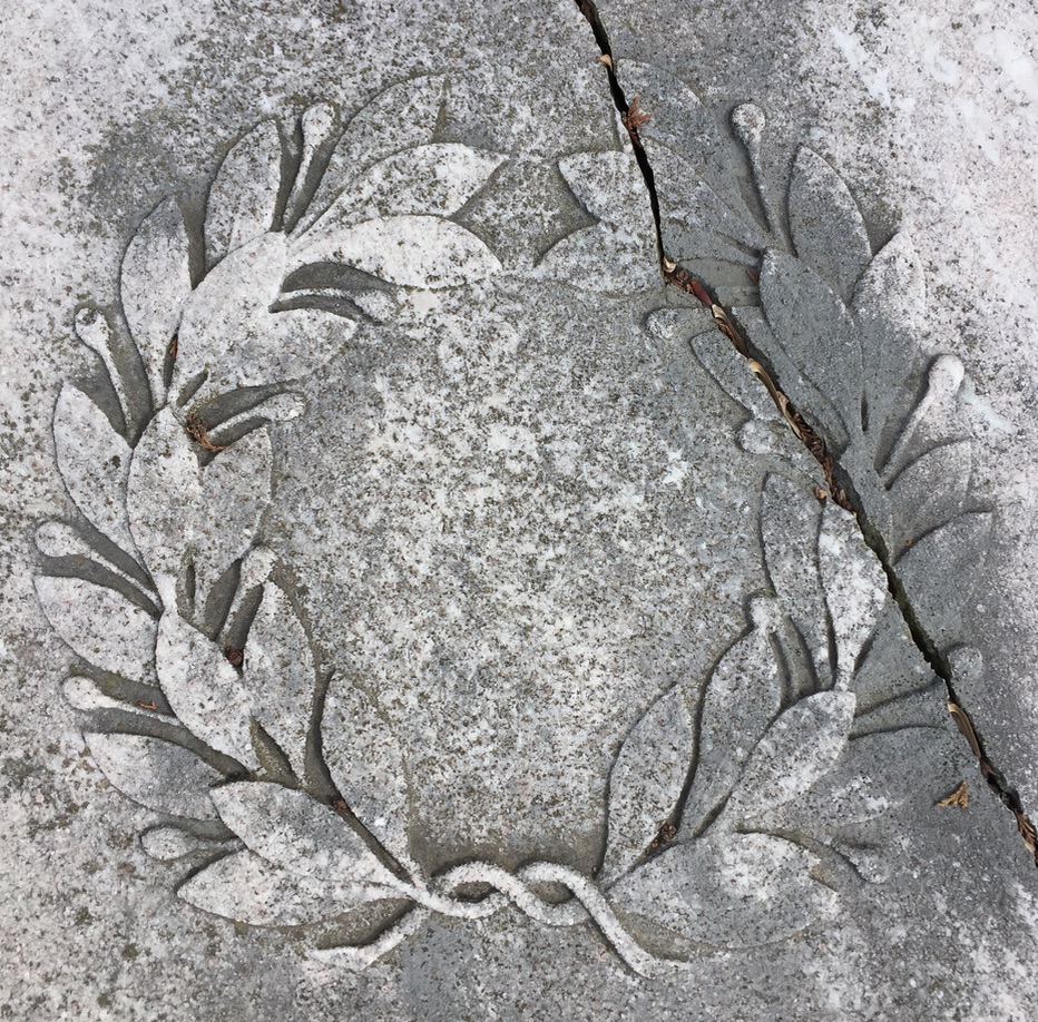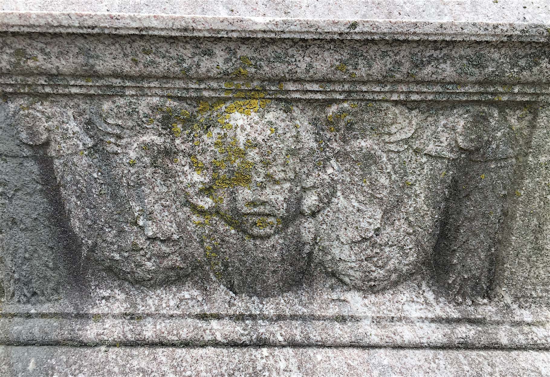 Note the similarities in the layouts of the Ellis Cromwell and Joseph Morrill Wells gravestones: a classical motif at the top, then an architectural cornice below it, then two bosses, then the inscription. Further, notice the similarity of the design of the two bosses–the round stone protrusions–on each of the gravestones.