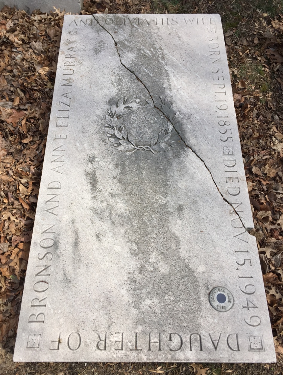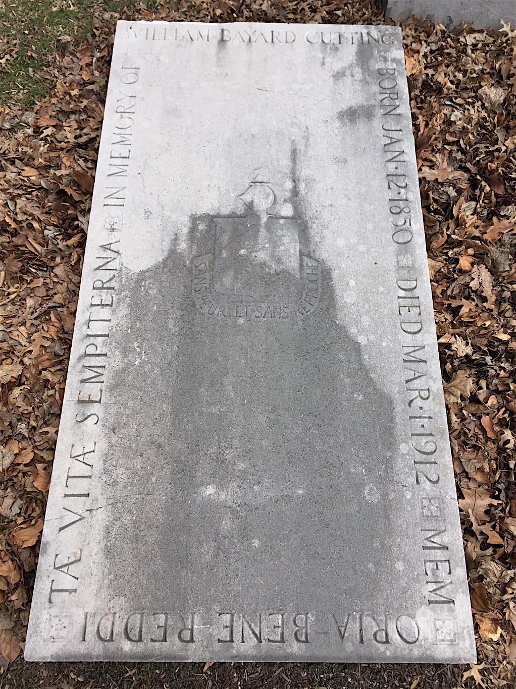 Directly to the right of William Bayard Cutting’s gravestone is that of his wife, Olivia. Though her gravestone does not appear on Roth’s list, it seemed to me that it might have been made by McKim, Mead & White. Though the founders of that firm were dead by 1928 (Charles McKim died in 1909; William R. Mead died in 1928), the firm was still in business into the 1960s–and therefore could have done this work in 1949, upon Olivia’s death. Further, these two tablets share a similarity of design and material. Note, also, that Olivia’s tablet, dating circa 1949, was meant to be a complement to that of her husband: the top line of his marker reads “William Bayard Cutting” and the top line of hers, directly to the right, reads “And Olivia His Wife.” Their gravestones are not just similar in design, but were designed to work together–a very nice touch in memorializing a husband and wife.