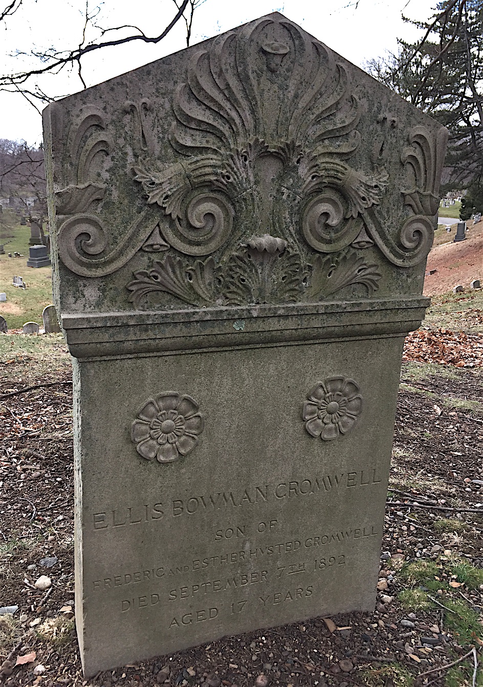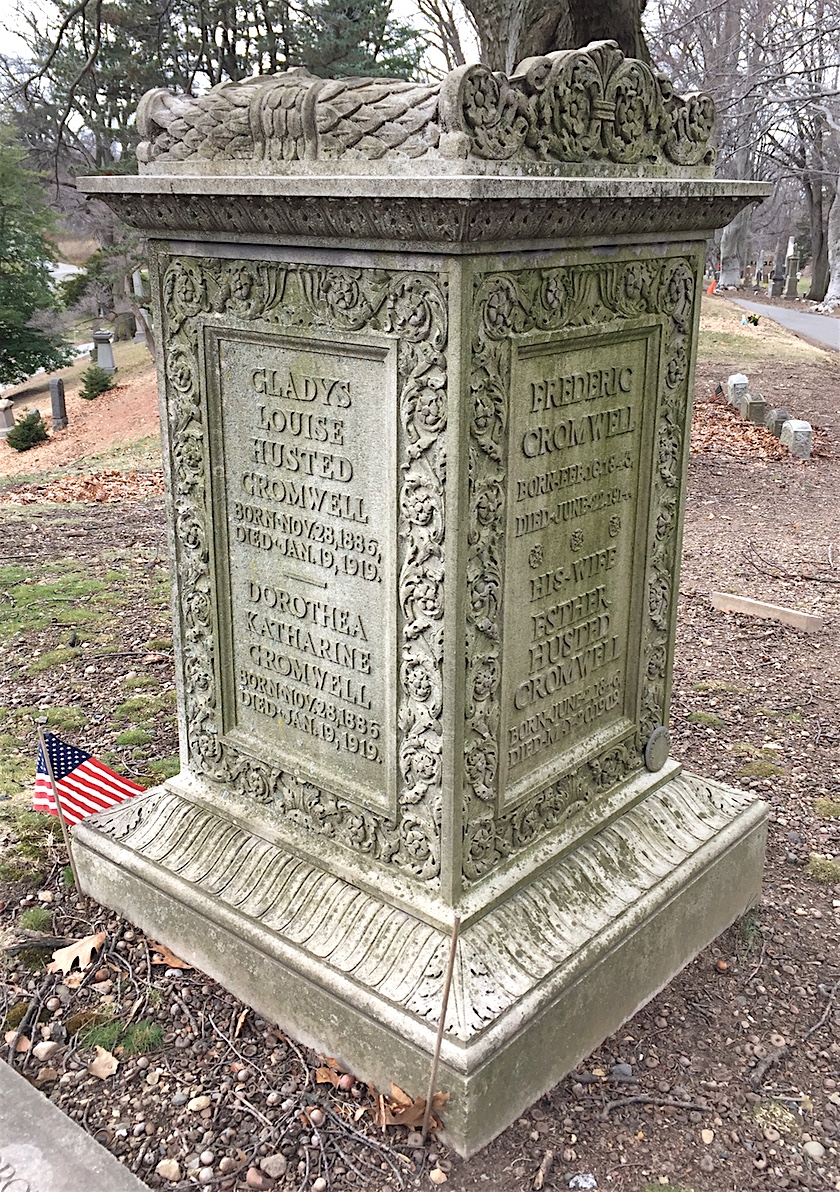 The great craftsmanship of this memorial is immediately apparent: it is wonderfully carved and finely detailed. The inscriptions for Frederic and his wife, Ester Husted Cromwell, are on the same panel. Note that I blogged about their twin daughters (“A Twin Tragedy”), who served as nurses in France during World War I, then killed themselves by jumping from the transport ship that was bringing them back to America. Their names and life dates are recorded on the panel at left in the photograph below; the top edge of the slab that is the sisters’ centotaph is at the bottom left of this photograph: