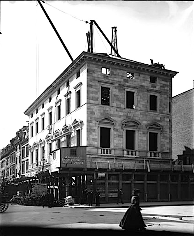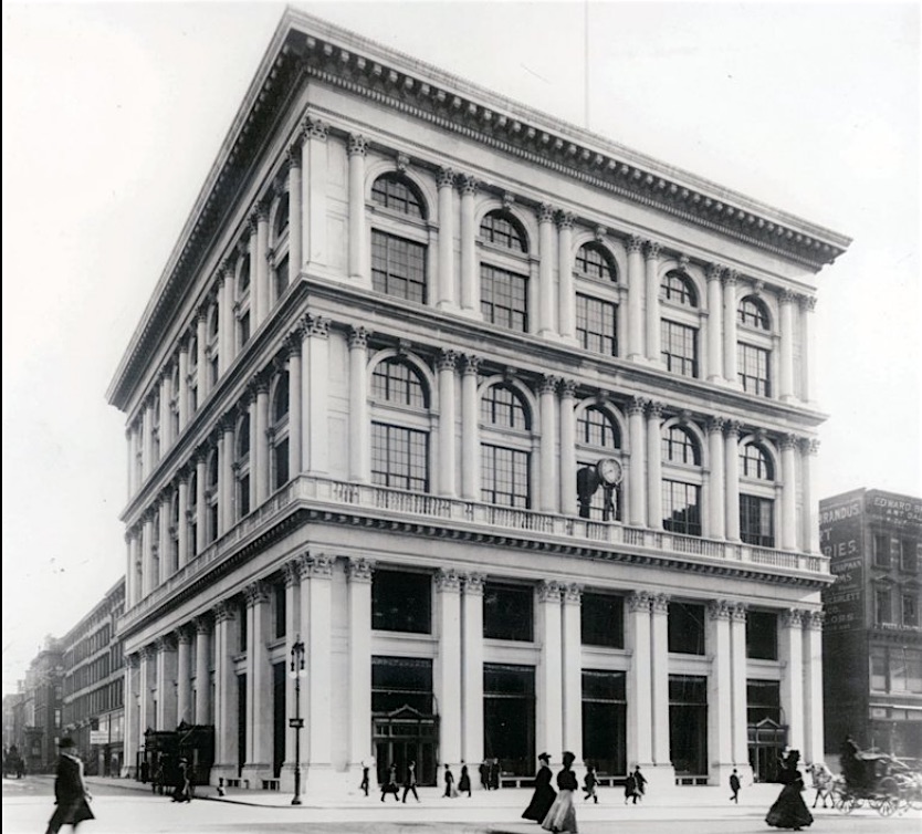 Professor Cuvaj was able to determine that Roth’s list likely is incomplete, based on known works by McKim, Mead & White at Woodlawn Cemetery that do not appear on that list. Indeed, as I was working on final edits of this post, I came across an entry in Roth’s list for the Tiffany & Company store and offices that were built at 401 Fifth Avenue in Manhattan. As per Roth’s entry, that building was designed by Stanford White, built 1903-1906, is still extant, and cost the incredible sum of $2,061,737 (the equivalent of $55 million today). It dawned on me, upon reading this, that in fact one of the columns from that building–designed by McKim, Mead & White–now stands at Green-Wood, in section 97, just off the intersection of Grove and Central Avenues, in the middle of Acorn Path. Sarah Amelia Hewitt went shopping at this Tiffany’s store one day, did not find a bauble worth buying, so instead bought one of the columns from inside the building to place as a memorial at Green-Wood for her deceased husband. Here is that building, soon after its opening: