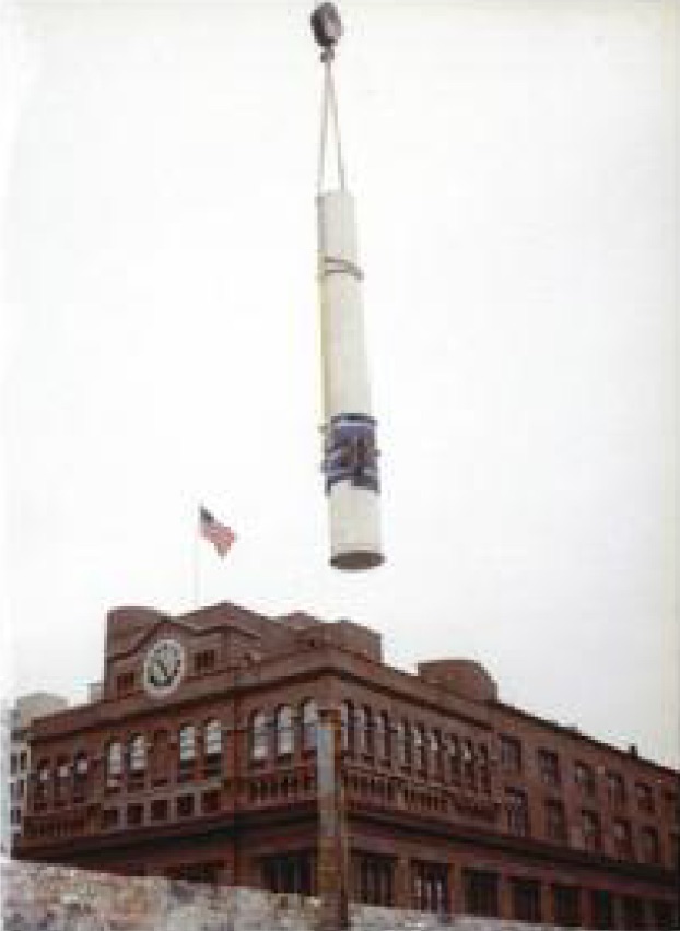 After Mrs. Hewitt purchased the column just a few years after her husband’s 1903 death, she had it installed on the Cooper-Hewitt island at Green-Wood, where her husband was interred. In 1932, the Hewitts’s son, Erskine, donated the column to the Hewitt Annex at Cooper Union as a memorial to his father. So it journeyed back to Manhattan, then came back to Green-Wood just a few years ago, when the Hewitt Annex was remodeled. Here it is, being lifted by crane up above the Cooper Union: