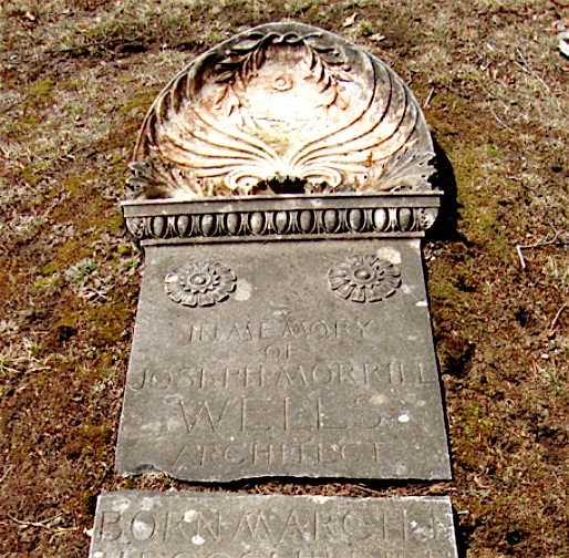 Samuel G. White, great grandson of Stanford White, and an architect himself, is the co-author, with his wife, Elizabeth White, of Stanford White, Architect. Sam, who is also a member of Green-Wood’s board of trustees, comments on Wells: “Wells was the employee of McKim, Mead & White who persuaded the partners to look at Italian Renaissance architecture for inspiration, and he is generally credited as the author of the elevations of the Villard houses. So he is an important, if somewhat neglected, figure in the history of American architecture.” As per Roth, when Stanford White joined McKim, Mead & White in 1879, there were already four draftsmen working there, including Joseph Morrill Wells. Roth describes him: “Wells was extremely gifted, not so much in plan organization as in the study of detail and ornament, and his contribution was so significant that in 1889 he was offered a partnership that, enigmatically, he refused. He died of pneumonia the following year.”