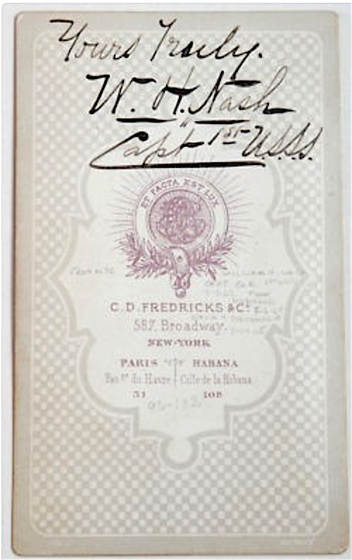 I contacted Gary Urbanowicz, leading historian of the New York Fire Department, who had posted this portrait online, asking him how he knew that this was Nash. Gary explained that he had gotten this photograph from a private collector. Gary had then checked the NYFD files and found the same photograph there with that “unmistakeable” mustache. Further, I was able to find this photograph online with what appears to me to be 19th-century handwriting on the back: